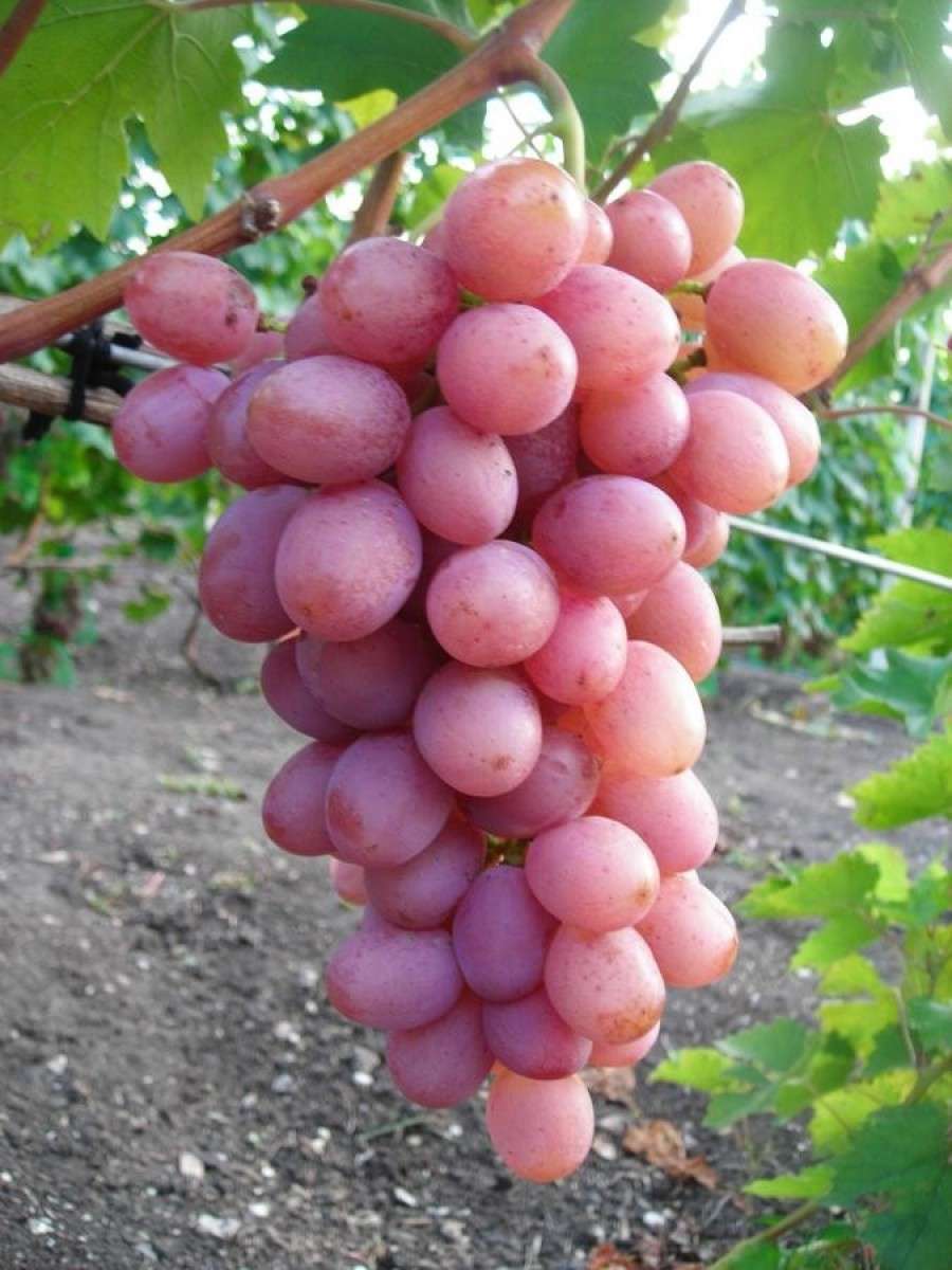 Гроздь достаточно крупная, среднеплотная. Ягоды округло-вытянутые, светло-розового цвета, отличаются повышенным содержанием сахара. Сорт обладает хорошей устойчивостью к грибным болезням и высокой урожайностью. Морозостойкость в пределах -22-23С.