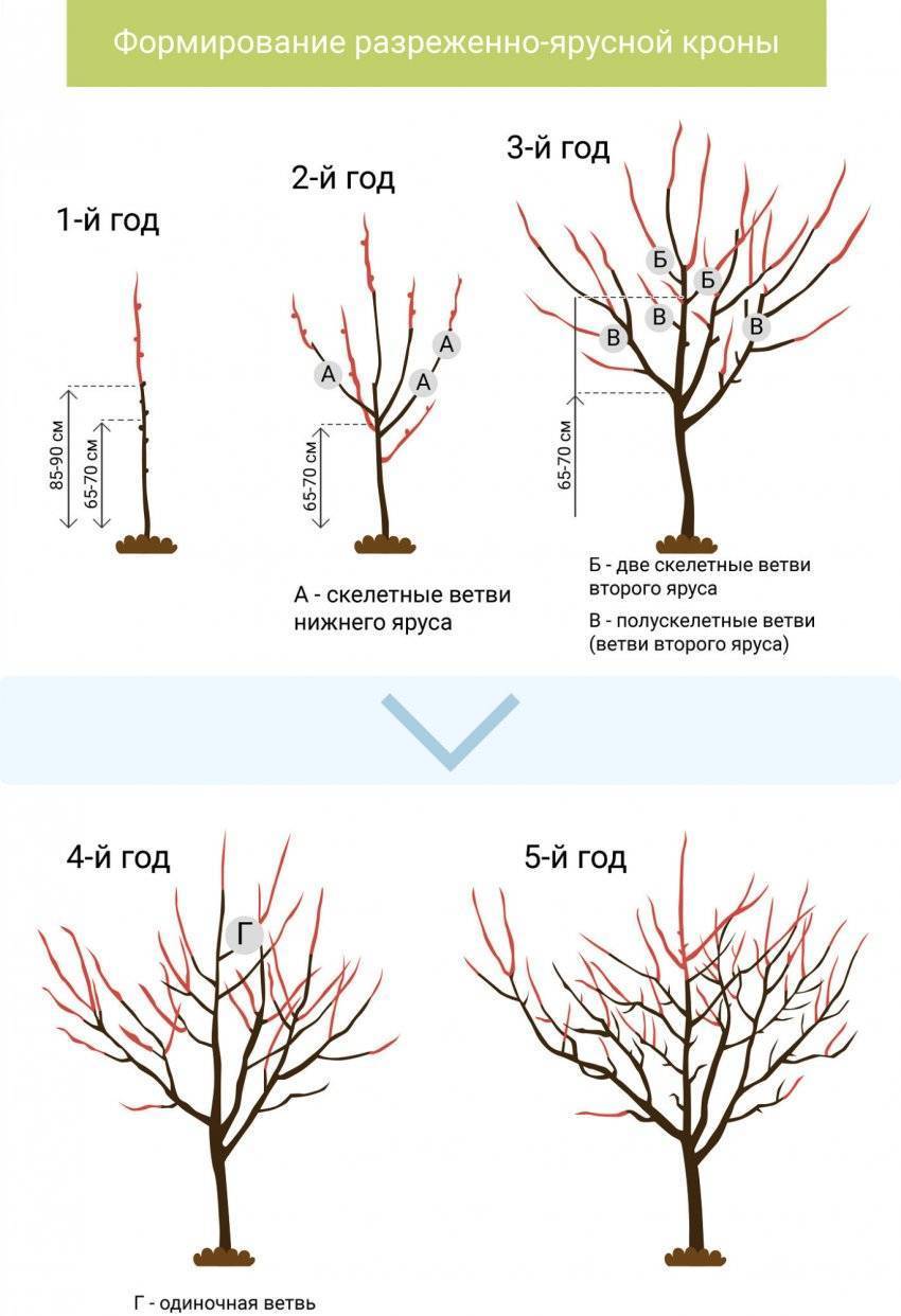 Нужно также следить, чтобы не было загущенности кроны. Для этого обрезают лишние и растущие в неправильном направлении ветки. Крону формируют в виде ярусов. При необходимости проводят санитарную обрезку. Для этой цели срезают сухие и поражённые болезнями ветки и отростки.