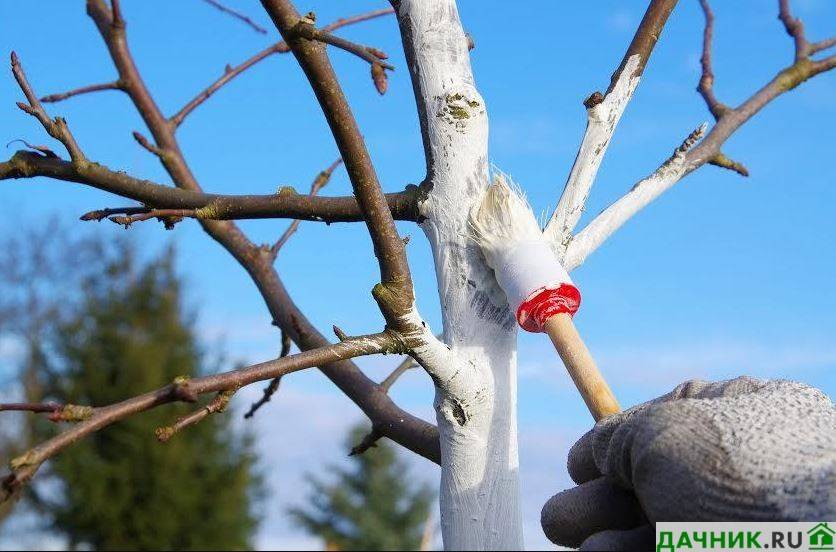 - После завершения влагозарядкового орошения ствол и основные ветки понадобится побелить. Вначале кора очищается от отслоившихся кусочков коры и мхов, далее обрабатывается побелочной смесью. В 10 л воды растворяется 2,5 кг негашеной извести, 0,5 кг медного купороса, 100 г столярного клея. Сметаноподобным составом выполняют побелку дерева;