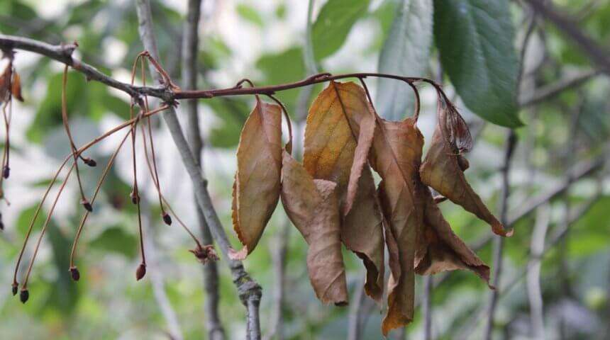 Это грибковое заболевание, возникающее из-за влажной и сырой погоды. Бутоны и побеги засыхают, кора трескается и выделяет смолу. Ягоды на таком дереве мельчают и деформируются. Болезнь легко переносится от дерева к дереву в ветреную погоду.