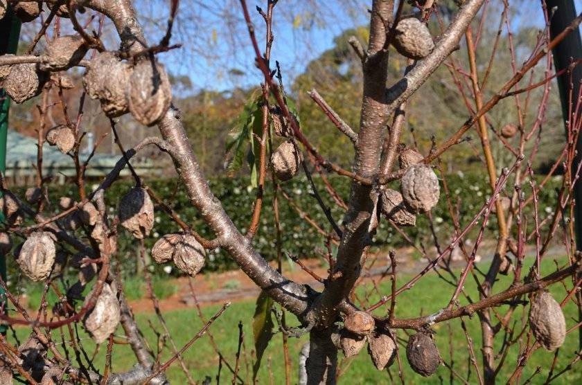 Очень опасное заболевание персиковых деревьев, в результате которого листья персикового дерева скручиваются, становятся маленькими и приобретают неестественный розовый цвет, который указывает на грибковую инфекцию. Зараженные листья становятся морщинистыми, толстыми и ломкими. В начальной стадии заболевания они светло – зеленые, затем краснеют. Сильно зараженные листья засыхают и опадают уже в июне. Больные деревья растут медленно, урожай плохой и деревья не устойчивы к заморозкам.