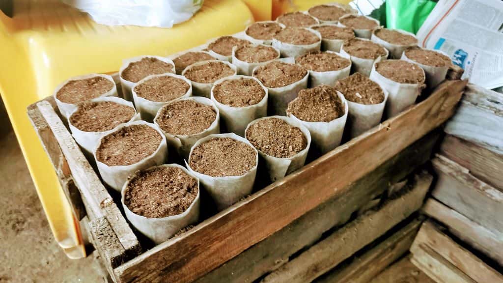 Лучше всего под арбузную рассаду использовать торфяные плошки среднего размера (около 10 см в диаметре). Но их легко можно заменить бумажными стаканчиками для напитков или пластиковыми емкостями из-под молочных продуктов. Подготовленную тару я наполняю нехитрой почва смесью: садовая земля (1/4 ведра) + зола (1 стакан) + калия сульфат (1 ч. ложка). Можно воспользоваться и таким рецептом: