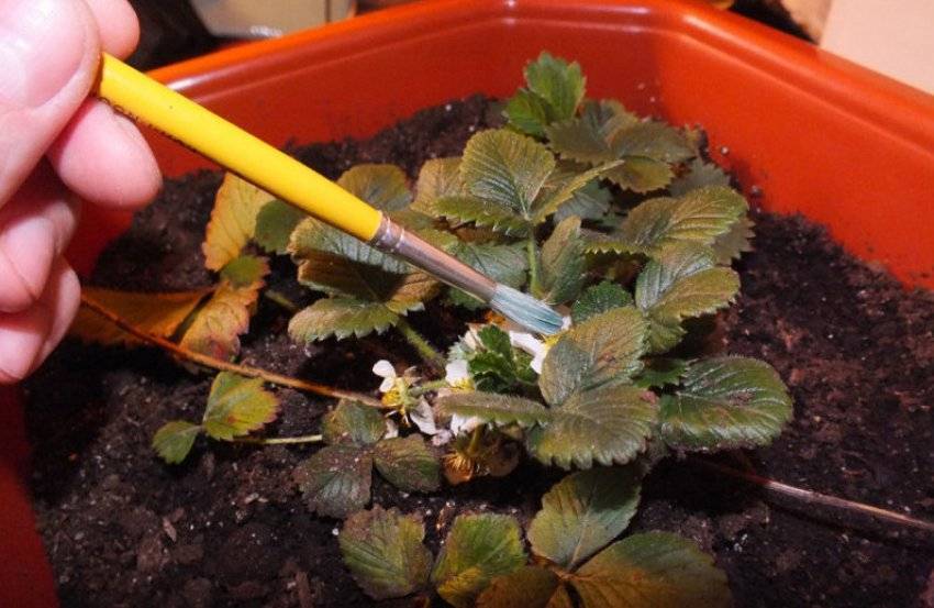 При выращивании клубники в комнатных условиях необходимо проводить искусственное опыление, если посаженый сорт не является самоопыляемым. Для этой цели можно воспользоваться вентилятором. Его включают в направлении посадок с клубникой. Воздушные потоки переносят пыльцу с одного растения на другие экземпляры. Этот процесс можно провести вручную при помощи кисточки с мягкой щетиной. Ею проводят от одного цветка к другому.