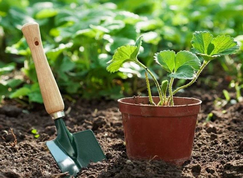 Когда все будет подготовлено, можно приступать в посадке саженцев (усов) клубники в горшок: