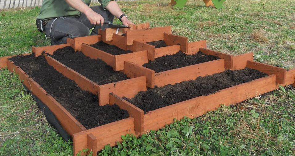 Заготовки скрепляются между собой гвоздями и клеем, а для большей прочности можно воспользоваться металлическими уголками/полосами и шурупами. Это значительно улучшить прочность каждого яруса отдельно, и всего строения в целом. Первый (основополагающий) ярус нужно заполнить предварительно подготовленной плодородной почвой, оставив сверху свободными 4–6 см, чтобы была возможность подкармливать и поливать растения.