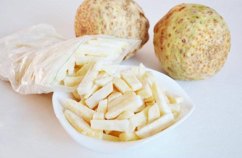 Для заморозки корень сельдерея очищают, режут на полоски и бланшируют. Заготовку просушивают и складывают в порционные пакетики в морозилку. Используют для приготовления соусов, супов.