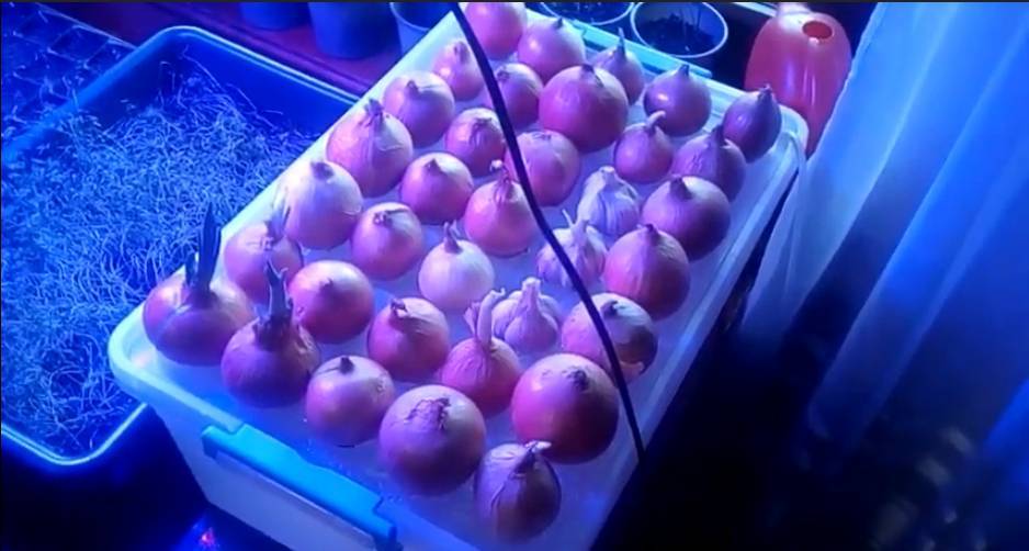 Первые полторы недели гидропонную установку держат в затемненном прохладном помещении, для интенсивного развития корневой системы. По прошествии этого времени «грядку» с луком переносят на свет.