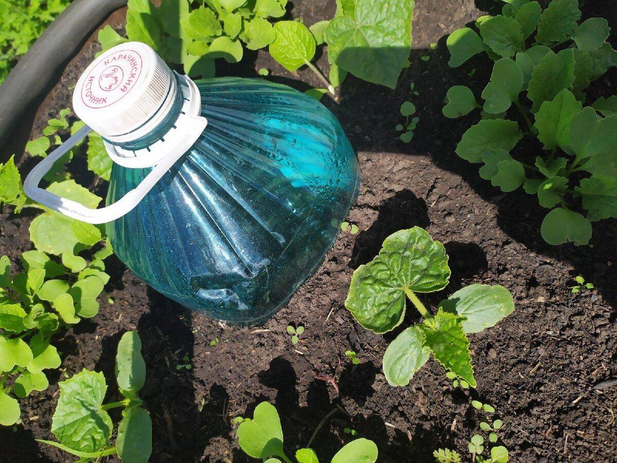 Закапывание в землю пластиковой бутылки с неплотным дном может обеспечить дополнительную влагу для корней