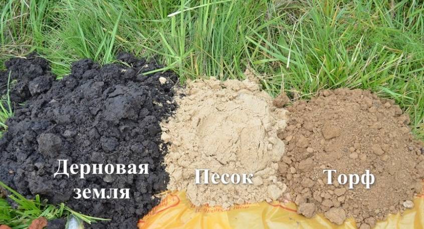 Опытные дачники советуют использовать комбинацию из торфа, дерновой почвы и перегноя. Все компоненты смешиваются в равных пропорциях. Поверх насыпают немного песка, чтобы сохранялась влага.