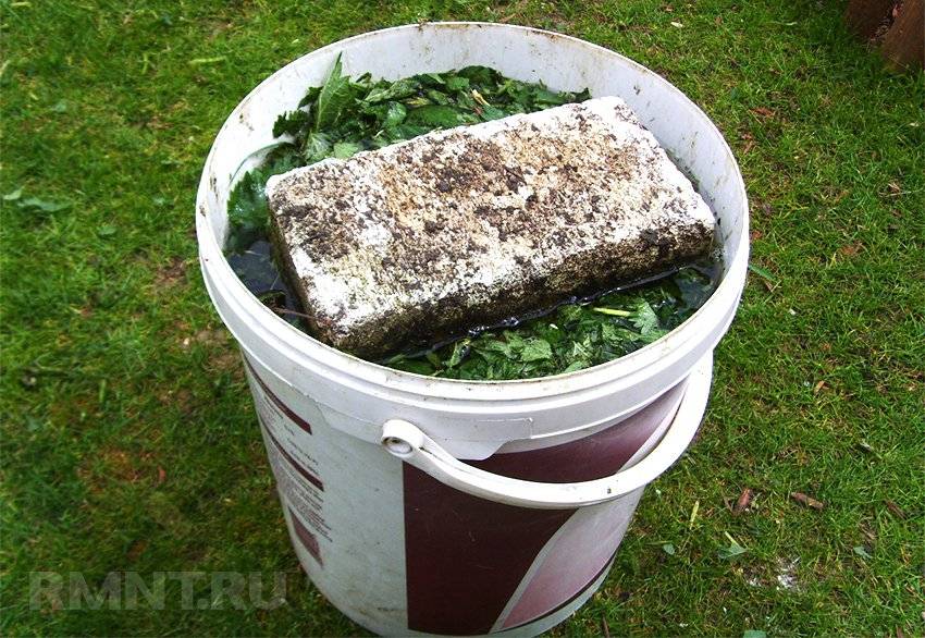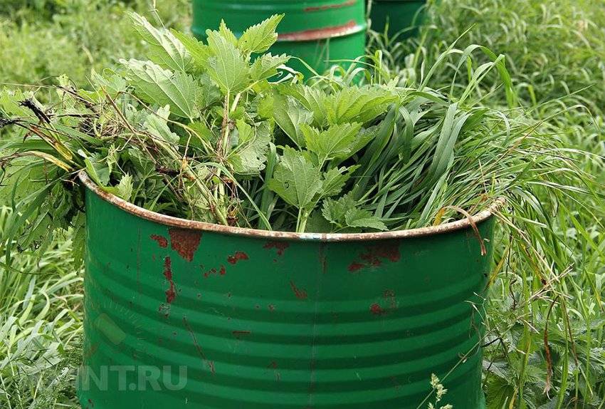 бочка на 2/3 заполняется сорной травой, высыпаются две совковые лопаты золы, доливается вода, ставится крышка. На приготовление уходит 10–14 дней. Разбавляется водой для полива из расчета 1 к 10;