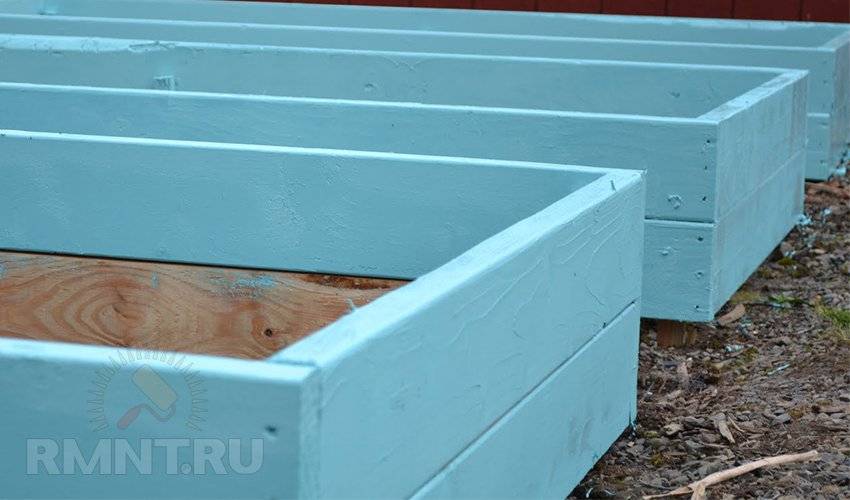 Землю (плодородный слой) желательно срезать и отложить рядом с будущей грядкой, поскольку она еще пригодится. Короб необходимо побелить или покрасить, чтобы земля в нем не перегревалась, а сама обшивка меньше повреждалась насекомыми.