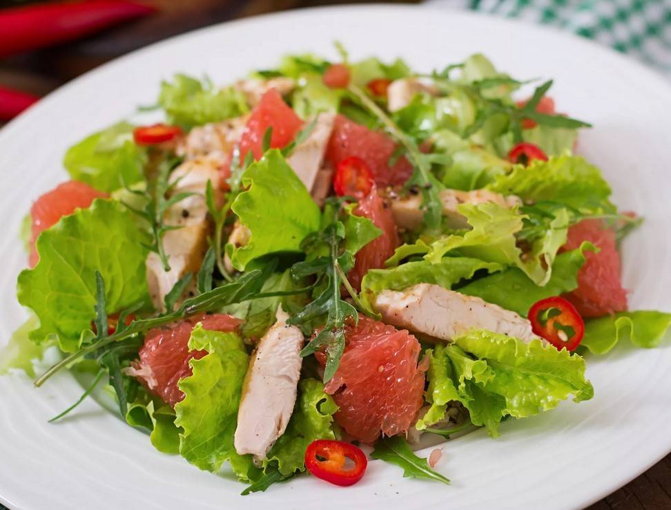 «Собрать» освежающий салат с добавлением мякоти цитрусового можно практически из любых продуктов. Пикантное пряно-горькое послевкусие блюду придадут такие ингредиенты:
