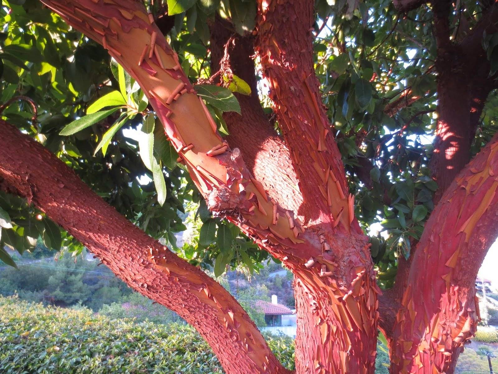 Высота дерева – около шести метров, и оно смотрится необыкновенно оригинально и декоративно круглый год благодаря своей тонкой коре, в которой отсутствует корка – верхний грубый слой. Иногда кажется, что коры нет совсем. Но в июле, в горячие, жаркие дни хорошо видно, как старая коралловая кора растрескивается и отслаивается тонкими, похожими на папирус, лоскутами, обнажая молодую, нежную, с пепельным оттенком оливково-зелёную кору. Сброс старой коры завершается к концу лета. Почти одновременно с корой опадает и половина прошлогодней листвы. А все эти метаморфозы происходят потому, что земляничник, как и многие другие вечнозелёные растения, вступает в середине лета в период частичного листопада: в пик засухи для экономии влаги ему необходимо сократить испаряющую поверхность, а обновившаяся зелёная кора начинает замещать отсутствующие листья, выполняя функцию фотосинтеза.