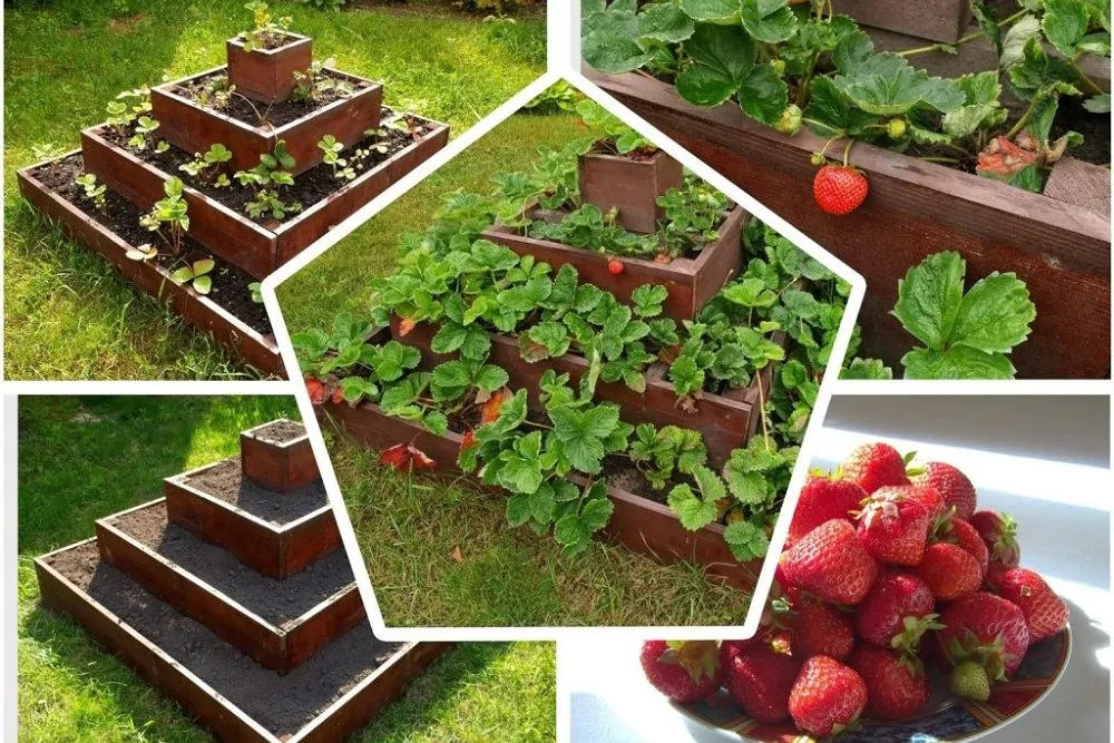 Вертикальные грядки. Один из способов выращивания ампельной земляники в теплицах. Грядки удобнее всего сделать из недорогих пластиковых труб – их устанавливают в теплице вертикально. Диаметр труб – примерно 50 см. В них делают отверстия диаметром 25 см. Трубы заполняют питательным субстратом, к ним подводят орошение, а затем высаживают рассаду. Также можно выращивать землянику в подвешенных вертикально мешках из плёнки, которые наполняются субстратом. Растения сажают в предварительно проделанные в полиэтилене отверстия.