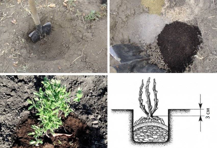 Важно! Высаживают кусты так, чтобы в месте посадки образовался небольшой холм высотой около 15 см, а корневая шейка саженца при этом углубилась примерно на 5 см