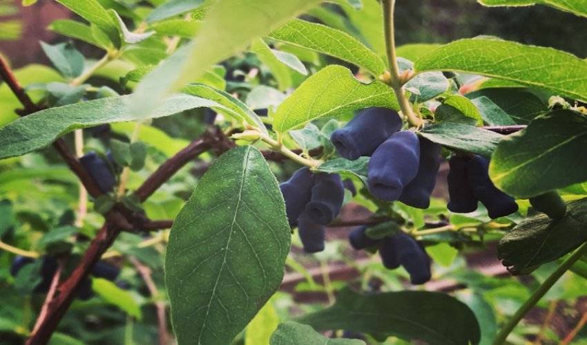 У жимолости сорта Золушка изящно изогнутые ветви, украшенные тёмными плодами с сизоватым налётом