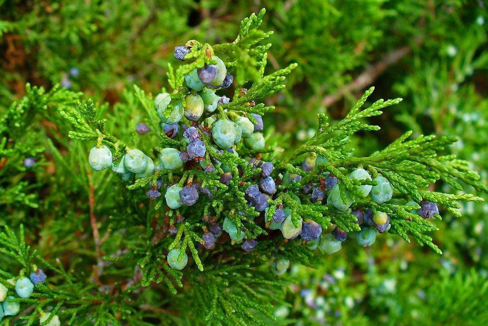 Хвоя у кустика голубовато-зелёная с выраженным ярким запахом. Ягоды тёмно-синие.