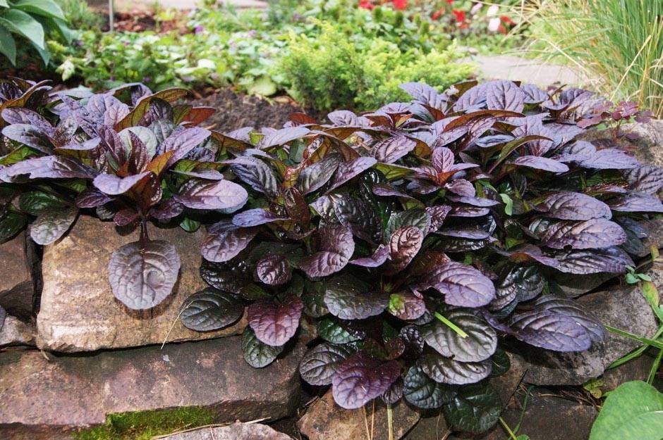 Среди большого разнообразия видов встречаются солнцелюбивые сорта с темно-красными, почти коричневыми листьями. Это живучка ползучая Атропурпуреа. Стелющийся сорт высотой до 20 см, цветоносы темно-синего цвета. Образует плотные подушки.