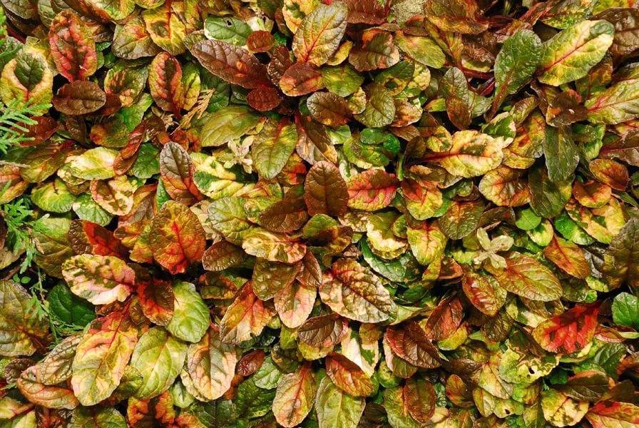 Одной из самых изменчивых живучек является живучка ползучая Бургунди Глоу. Окраска листьев зависит от состава почв и интенсивности освещения. Встречается светло-зеленая, розовато-голубоватая и других оттенков, с кремовыми прожилками. Если посадить розовую розетку, а затем по мере разрастания поделить ее, то получатся кустики всех вариантов расцветки. Живучка Бургунди Глоу, пожалуй, самый красивый сорт.
